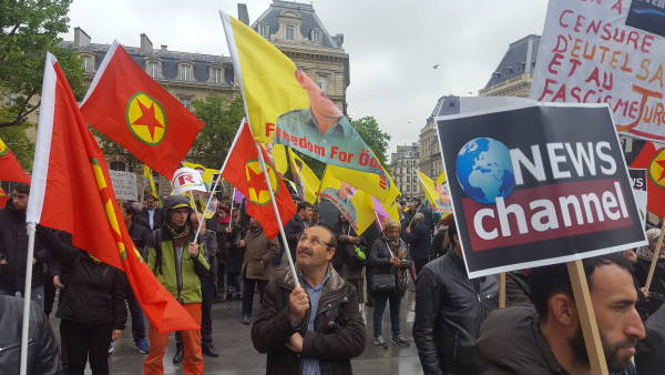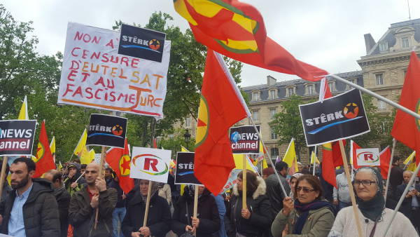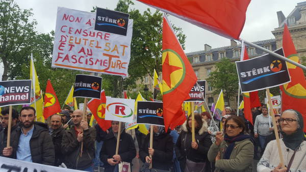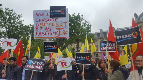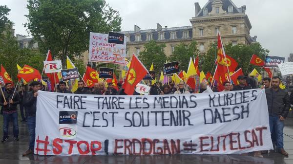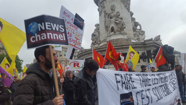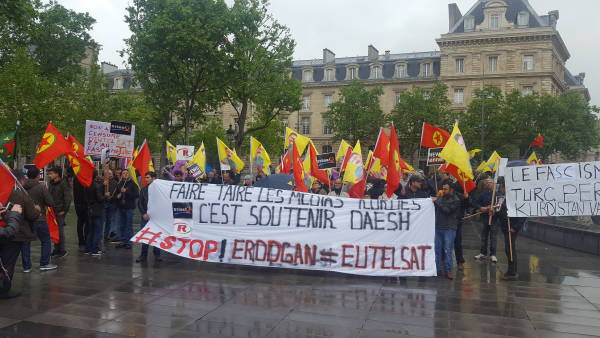 Fransa'nın başkenti Paris'te Fransız uydu şirketi Eutelsat ile Türk devletinin kirli çıkar ilişkileri sonucu kapatılmak istenen Kürt televizyon kanalları için eylem yapıldı.
