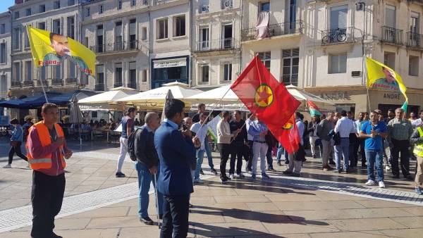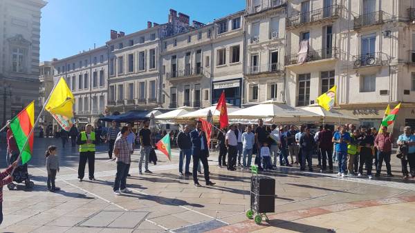 Demokratik Kürt Toplum Merkezinin (DKTM) çağrısıyla Peyrou Pitot Parkı’nda toplanan Kürdistanlılar, şehir merkezindeki Comedie Meydanı’na kadar yürüdü.