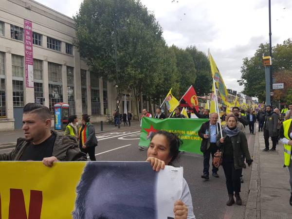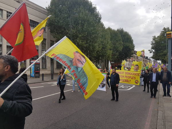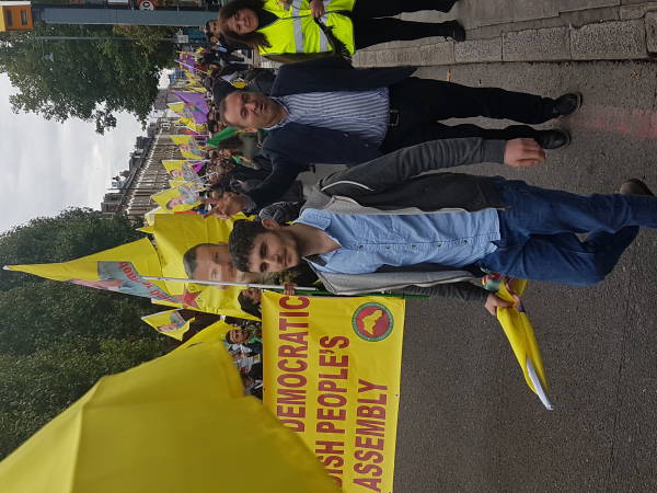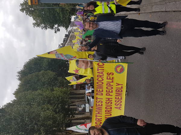 Roj Kadın Meclisi öncülüğündeki yürüyüşe Britanya Kürt Halk Meclisleri de katıldı. Binin üzerinde katılımın olduğu eylem, Halkevi önünde başladı. Yürüyüşte "Bijî Serok Apo", "Katil Erdoğan" sloganları atıldı. Yürüyüşte Şehit Fırat Dağ da anıldı.