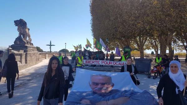 Yürüyüş boyunca sık sık “Bijî Serok Apo”, “Öcalan'a Özgürlük”, “Katil Erdoğan” sloganları atan eylemciler, Fransızca hazırlanan bildirileri dağıttı.