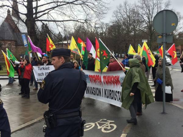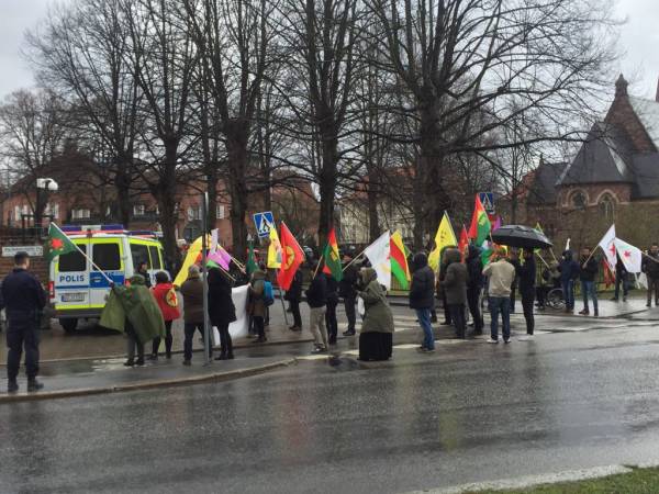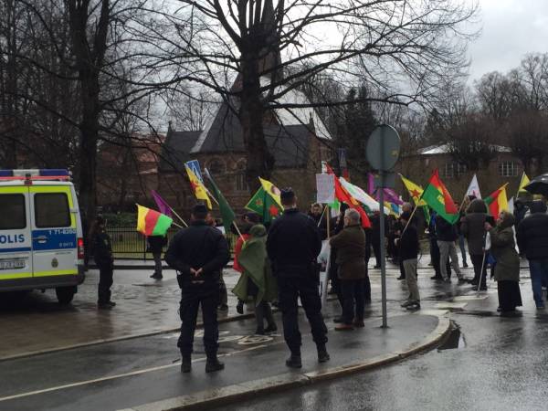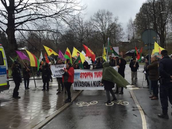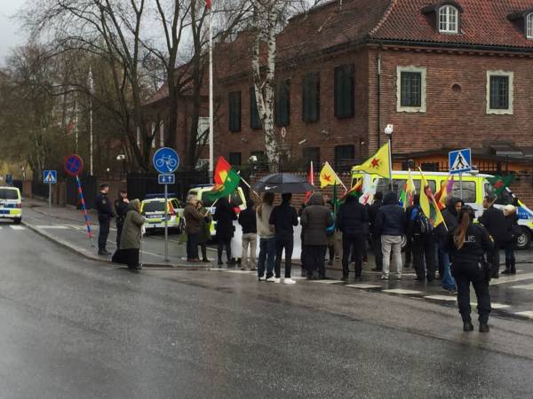 Stockholm’de Türkiye Büyükelçiliği binası önünde bir araya gelen Kürdistanlılar, “Türk devleti Rojava’dan defol”, “Kürdistan faşizme mezar olacak”, “Kanlı ellerinizi Şengal ve Rojava’dan çekin”, “Faşist Erdoğan”, “Katil devlet hesap verecek” sloganlarını attılar.