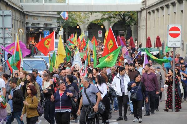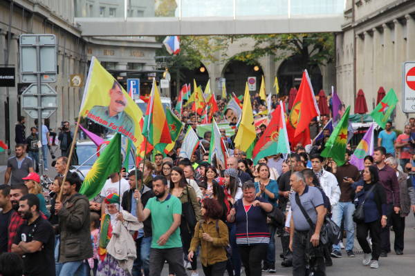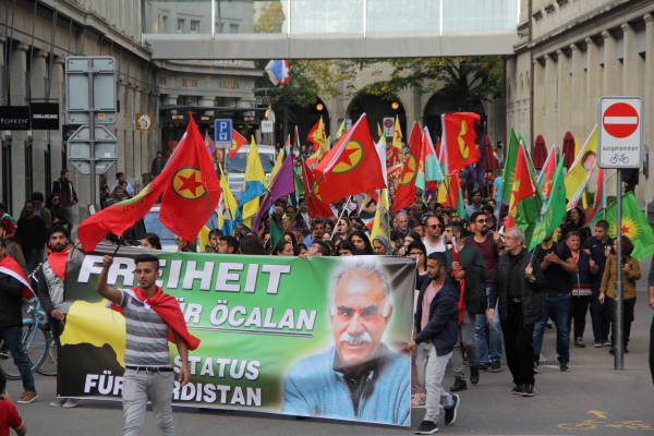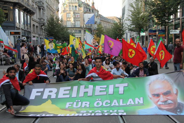 Helvetiaplatz’da “Öcalan’a özgürlük Kürdistan’a statü” pankartı arkasında bir araya gelen binler şehir merkezinde 3 km kat ederek bir yürüyüş gerçekleştirdi. Yürüyüş boyunca Öcalan posterlerinin yanı sıra PKK, KCK, YPG, YPJ bayrakları taşıyan kitle sık sık “Öcalan’a özgürlük”, Biji Serok Apo”, “Öcalan’sız yaşamı başınıza yıkarız”, “Terörist Türkiye”, “Katil Erdoğan” sloganları attı. Yine yürüyüş boyunca Öcalan posterleri balonlara bağlanarak Zürih semalarında uçuruldu.