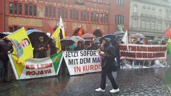 Dem-Kurd ve Basel Ronahî Kadın Meclisi öncülüğünde kanton parlamentosunun önündeki eyleme çok sayıda kişi katıldı.