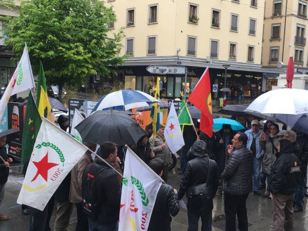 KCK, PYD bayraklarının taşındığı eylemde sık sık “Katil Erdoğan”, “Terörist Türkiye” sloganları atılırken, eylemde bir konuşma yapan Cenevre Kürt Toplum Merkezi Eşbaşkanı Salih Sağlam, Türk devletine karşı herkesi alanlara çıkmaya çağırdı.