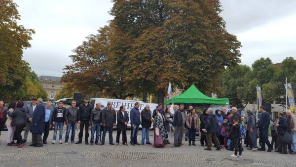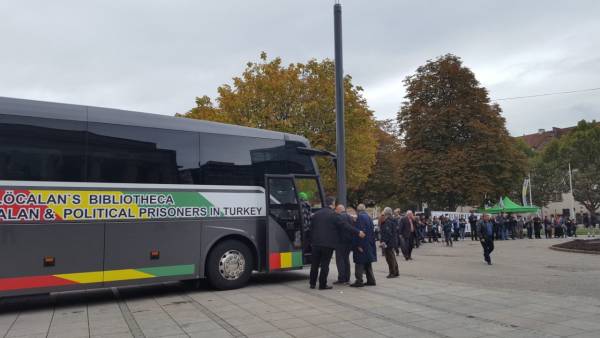 9 Ekim'de Strasbourg'dan yola çıkan “Öcalan kütüphanesi” otobüsünü Stuttgart’ta yaşayan Kürdistanlılar Schlossplatz Meydanı’nda karşıladı.
