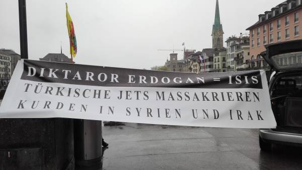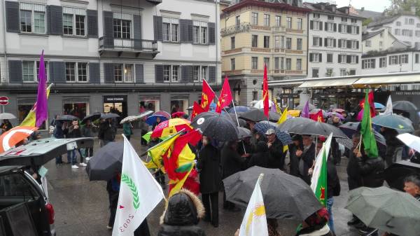 Yoğun yağan yağmura rağmen Zürih Meclis’in önünde bir araya gelen yüzlerce Kürdistanlı, Rathausbrücke’de protesto mitingi gerçekleştirdi.