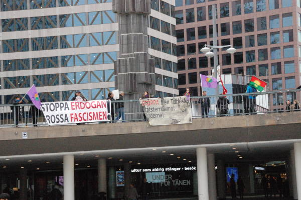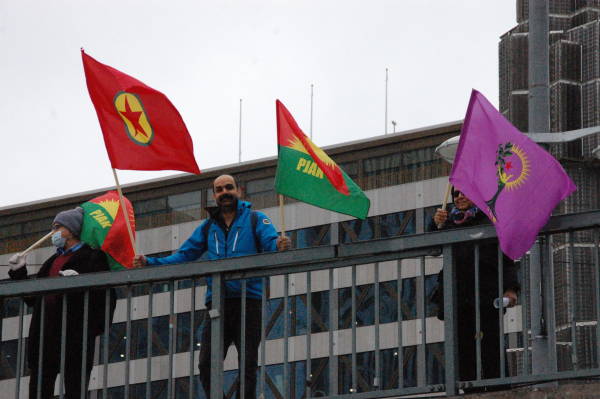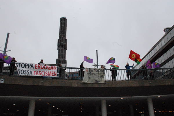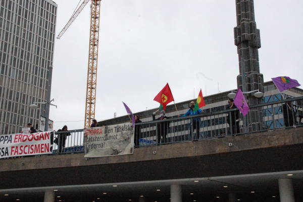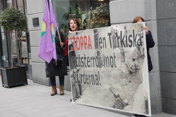 Amara Kadın Meclisi'nin çağrısı üzerine Stockholm'mde taşıt trafiğine kapalı Drottningsgatan Caddesi'nde bir araya gelen Kürdistanlılar, PKK, KCK ve Kürt Kadın Hareketi'nin bayrakları ile "Türk devletinin Kürtlere düşmanlığına sessiz kalma”, “Türk devletinin işgalini durdurun” yazılı dövizler taşıdı.