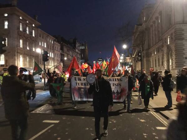 Yapılan konuşmaların ardından kitle Başbakanlık binasına doğru yürüyüşe geçti. Başbakanlık binası önünde ‘Terörist TC’ sloganları atarak, Borris Johnson Hükümeti’nin sessizliği protesto edildi.