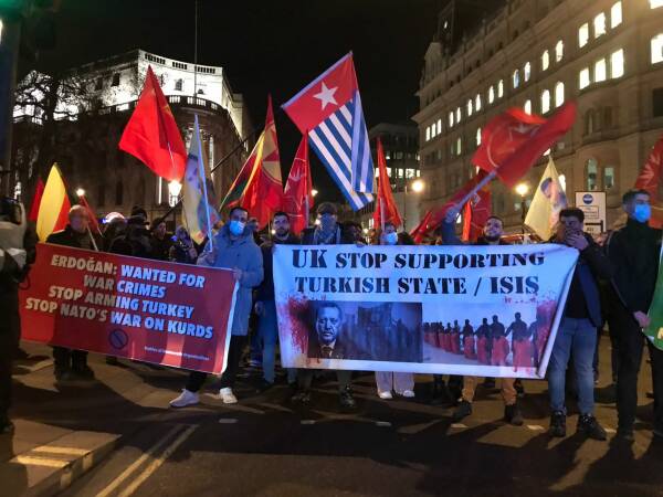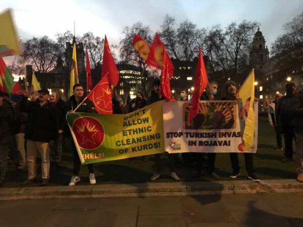 Londra Parlamentosu önünde bir araya gelen Kürdistanlılar, Türk devletinin saldırılarını protesto ederken, kentin en işlek meydanı Trafalgar Meydanı’na açılan yolları trafiğe kapattı.