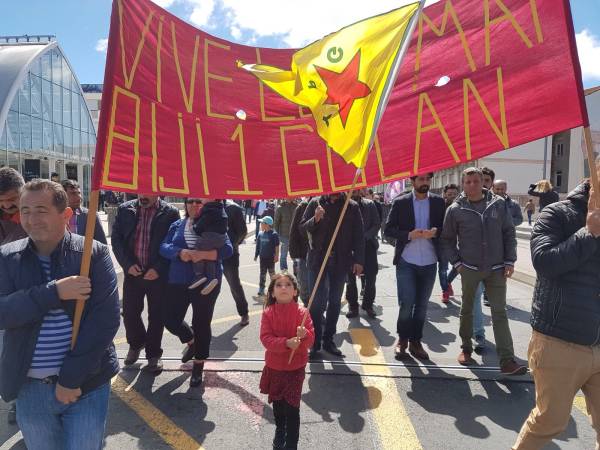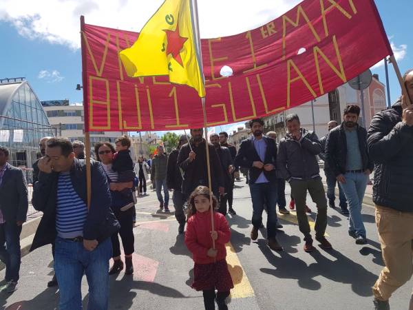 Yürüyüşte Kürtler de Öcalan posterleri ve PKK, PYD, KODAR, YPG/YPJ flamalarıyla yer aldı.