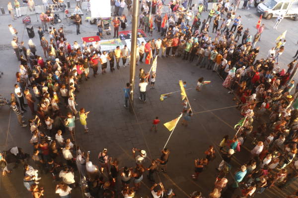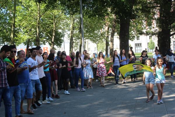 Kürtçe türkü ve marşlar eşliğinde halaya duran Kürdistanlılar, “Biji Serok Apo” sloganını atarak eylemlerini sonlandırdı.