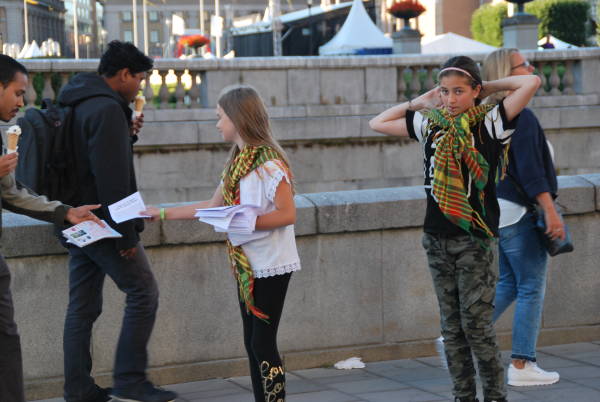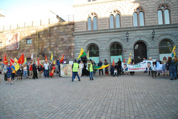 Yol boyunca özgürlük türküleri söyleyen “PKK halktır, halk biziz”, “Türk ordusu Kürdistan'dan defol”, “Katil Erdoğan”, “Öcalan'a özgürlük, Kürdistan'a barış” sloganları atarak parlamento binasının yanındaki Mynttorget Meydanı'na geldi.