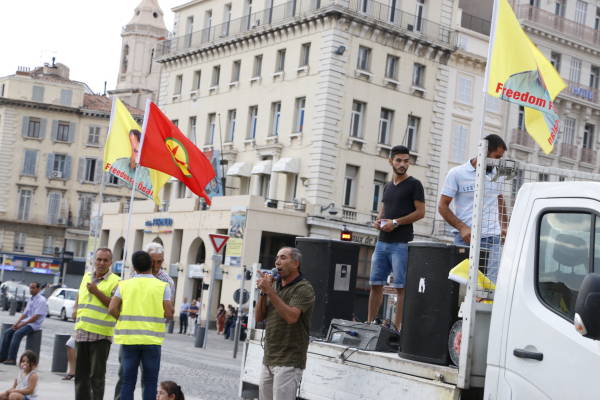 Çadırın kurulduğu Vieux-Port Meydanı'na kadar yürüyen eylemciler daha sonra miting yaptı. Kürdistan Ulusal Marşı 'Ey Raqip'le saygı duruşunun yapıldığı mitingde DTKM üyesi Azad Şirnexi bir konuşma yaptı.