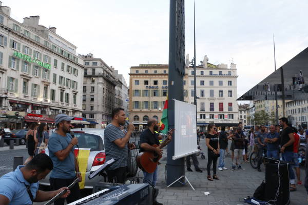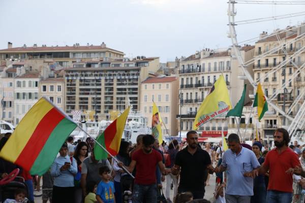 Kürdistan devrim şehitleri için yapılan bir dakikalık saygı duruşunun ardından kutlamanın amacını anlatan Fransızca bildiri okunurken, Kürt Halk Önderi Abdullah Öcalan'ın posterleri, YPG-YPJ ve PYD flamaları taşındı. Vieux-Port Meydanı'nda Marsilya TEV-ÇAND üyeleri Hozan Renas ile Serdar'ın şarkılarıyla halaya duran Kürdistanlılara Fransız, Arap ve çeşitli halklardan turistler de eşlik etti.