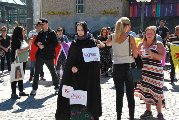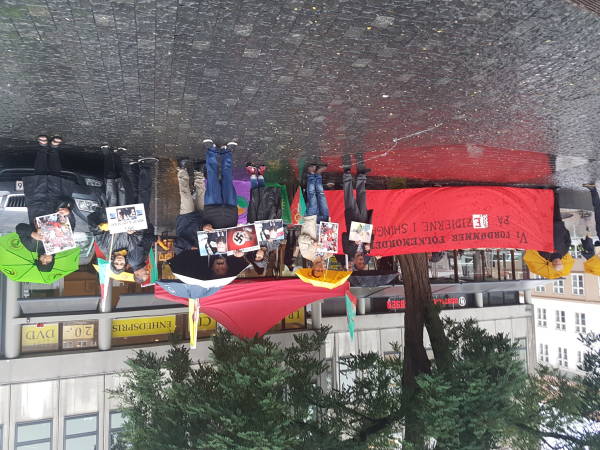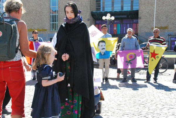 Eylemde, kara çarşaflar içinde gözleri bağlı bir Kürt kadınının giysisinin üzerine “Savaş”, “Tecavüz”, “Milliyetçilik”, “Kadın ticareti”, “İşkence” ve “Sokırım” yazılı dovizler asıldı. Eylemcilerin çağrısı üzerine İsveçliler sembolik olarak dövizleri yırttı, çarşafı çıkardı ve Êzidî kadınını özgürleştirdi.