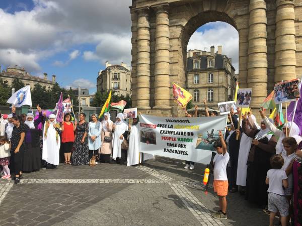 Bordeaux Sosyalist Kadınlar Birliği ve TJK-E Bordeaux Kürt Kadın Hareketi'nin öncülüğünde Victoria Meydanı'nda bir araya gelen kadınlar, Fransızca "DAİŞ'e karşı savaşanların yanındayız" pankartını taşıdı. Eylemde sık sık "Katil DAİŞ", "Kadın, Yaşam, Özgürlük", "Yaşasın Şengal Direnişi", " Kahrolsun Türk Devleti" sloganları atıldı.