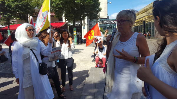 Eylemde, esir alınan kadınları ve özgürleşen kadınları anlatan kısa bir tiyatro gösterimi yapıldı. Kadın kurumları adına Fransızca yapılan açıklamada, katliamın kadın ve çocuklar açısından bilançosuna dikkat çekildi. Benzer zulmü Türkiye ve Kürdistan'daki kadınların da yaşadığına vurgu yapılarak, HDP Eş Genel Başkanı Figen Yüksekdağ'ın da aralarında olduğu kadın siyasetçilerin uğradığı faşizme değinildi.
