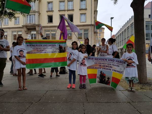 Almanya'nın Dresden kentinde UTA Kadın Meclisi ve PYD tarafından düzenlenen Şengal eylemine çok sayıda kişi katıldı.