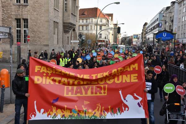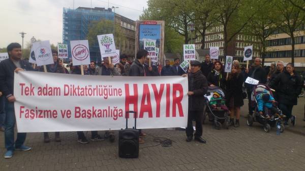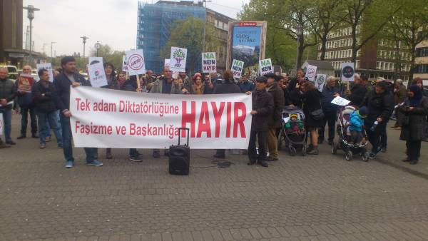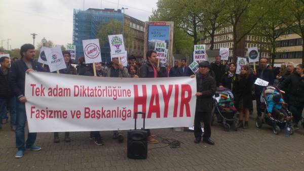 “Tek adam diktatörlüğüne, faşizme ve başkanlığa HAYIR” pankartı açan kitle, sık sık Almanca “Hırsız, Faşist Erdoğan”, “Yaşasın Uluslararası Dayanışma”, “Direnenler Kazanacak”, “Diktatörlüğe Hayır” sloganları attı.