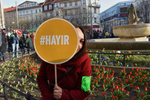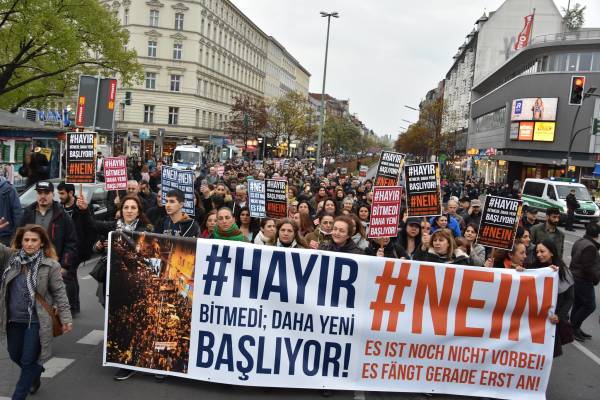 Saat 18.00 da Hermanplatz da başlayan yürüyüşte Almanca, Kürtçe ve Türkçe “Hayır” yazılı dövizler taşındı. Kitle etkinlik boyunca;” Bitmedi daha yeni başlıyor”, “Faşizme geçit yok”, “Diktatöre karşı el ele” ve “Sonuna kadar direneceğiz” sloganlarını haykırdı.