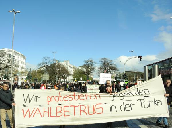 Almanya’nın Hamburg kentinde yaklaşık 700 kişi ‘Hayır, daha bitmedi’ sloganıyla Türkiye’deki referandum hilelerini protesto etti.