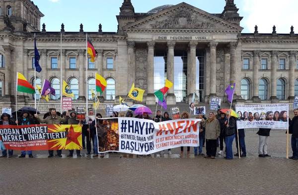 NAV-DEM Berlin tarafından organize edilen protesto gösterisi, Almanya Federal Parlamentosu önünde yapıldı. Kürt Halk Önderi Abdullah Öcalan’a yönelik tecrit, cezaevlerinde tutsaklara yönelik baskılar, 16 Nisan referandum sonuçları ile AKP politikalarının protesto edildiği gösteri de taşınan pankartta Almanya hükümetine Türkiye ile ilişkilerinin kesilmesi çağrısı yapıldı.