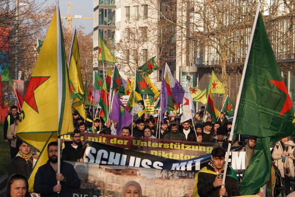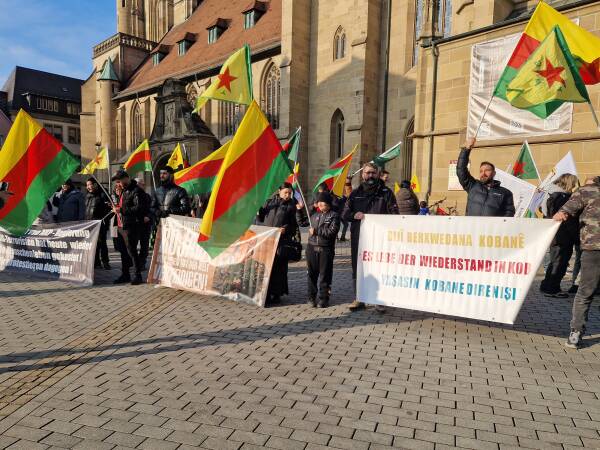 Almanya'nın Stuttgart kentinde FED-GEL federasyonunun çağrısı üzerine Lautenschlagerstrasse'de bir araya gelen Kürdistanlılar ve dostları, Türk devleti ve desteklediği çetelerin Rojava'ya dönük işgal saldırılarına karşı yürüdü.