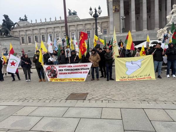 Avusturya’nın başkenti Viyana’da, Kürdistanlılar Tişrîn Barajı’na yönelik saldırılarını protesto etmek amacıyla Avusturya Parlamentosu önünde toplandı.