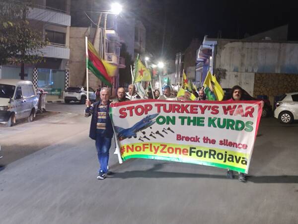 Kıbrıs’ın Limasol kentinde Kıbrıs Kürt Halk Meclisi'nin çağrısı ile Theofilos Kürt Kültür Merkezi önünde bir araya gelen Kürdistanlılar ve dostları, Türk devleti ve desteklediği çetelerin Rojava’ya dönük işgal saldırılarına karşı yürüdü.