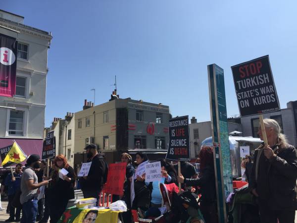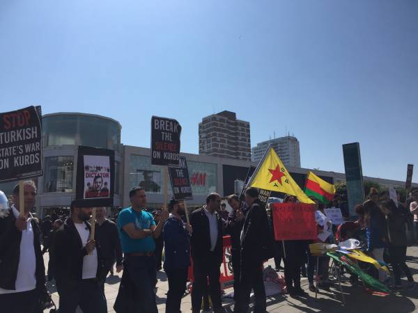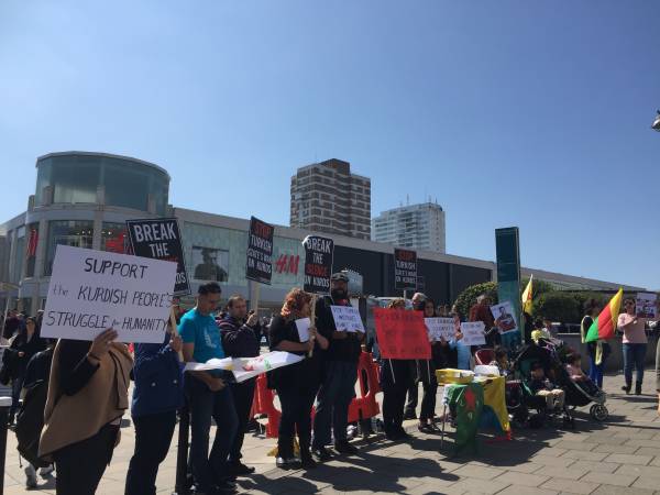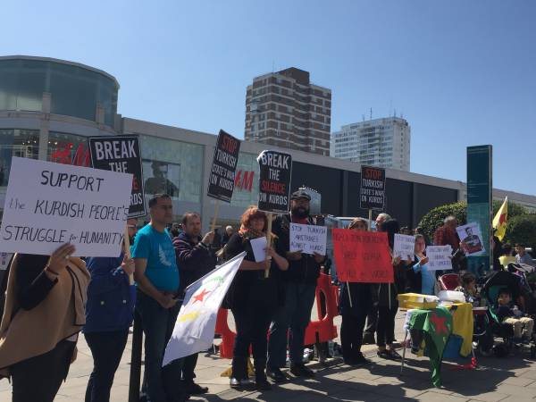 Sussex Kürt Toplum Merkezi tarafından organize edilen protesto eylemine çok sayıda kişi katıldı. Türk devletini kınayan pankartların açıldığı eylemde AKP hükümeti ve DAİŞ ilişkisine dikkat çekilen bildiriler dağıtıldı. Eylemciler Kuzey Suriye’nin Türkiye için uçuşa yasak bölge ilan edilmesini de istedi.