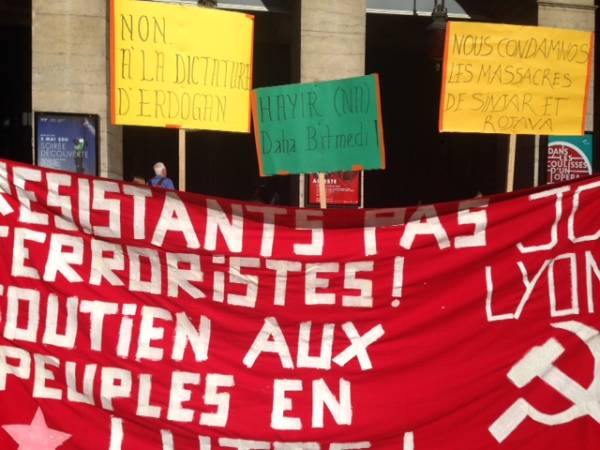 Fransa’nın Lyon şehrinde de HAYIR platformunun çağrısıyla şehir merkezinde Türk devletinin Şengal ve Rojava’ya yönelik saldırılar protesto edildi. Eylemde AKP hükümetinin referandum sonuçlarını manipüle etmesi de kınandı.