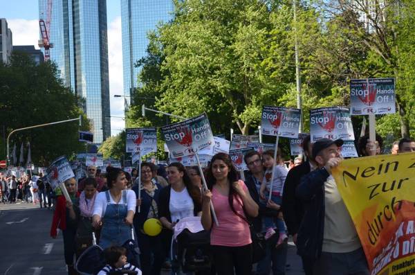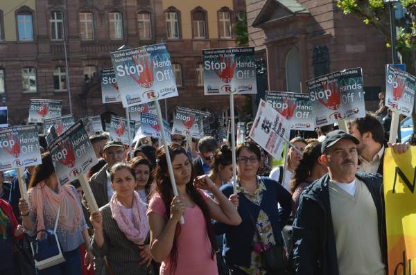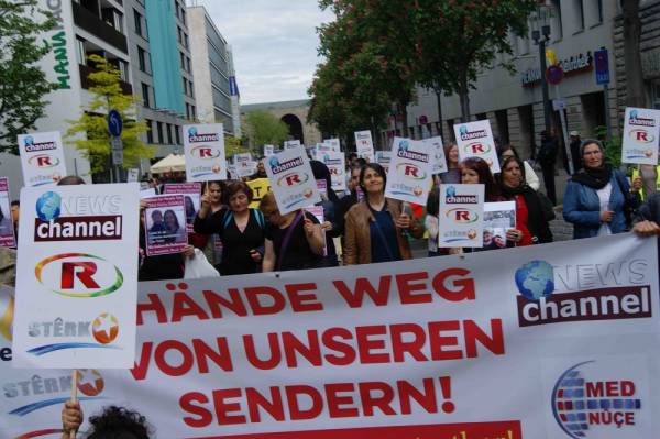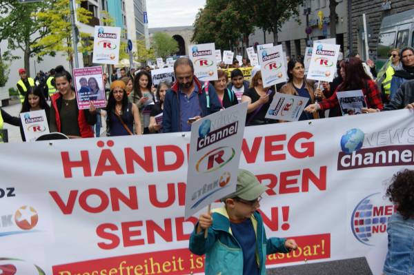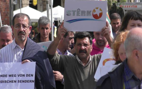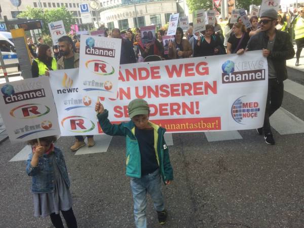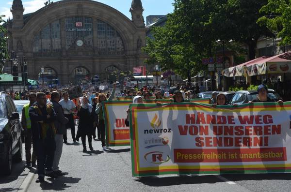 HBF önünde başlayan yürüyüşte “Kürt basını üzerinde ellerini çek”, “Rojava ve Şengal’e dokunma”, “Erdoğan diktatörlüğüne hayır” pankartlarının yanı sıra “Stêrk TV, News Channel ve Ronahi TV’ye dokunma” yazılı dövizler taşındı. Türkiye’de tutuklu bulunan Alman gazeteciler Deniz Yücel ile Meşale Tolu’ya özgürlük talebinin bulunduğu pankartların da olduğu yürüyüş Römer Meydanı’na kadar sürdü. Yürüyüş boyunca sık sık, Eutelsat ve Erdoğan aleyhine sloganlar atılarak, Kürt TV’lerinin yayınlarının kesilmesi kararına tepki gösterildi.