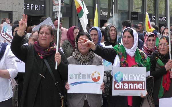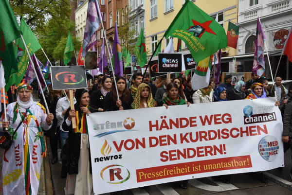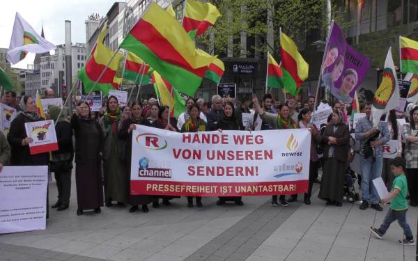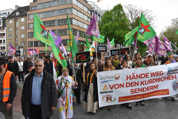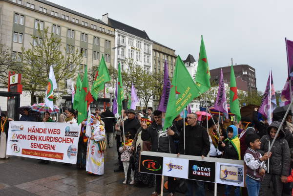 Hamburg, Bremen ve Kiel’den Kürdistanlılar ve dostlarının katılımı ile düzenlenen yürüyüşte, Eutelsat’ın bu kararı protesto edildi.
