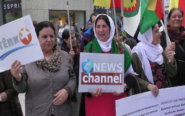 Ellerinde “Kürt televizyonları susturamaz” yazılı bir pankart taşıyan eylemciler, Türk devleti ve AKP Hükümeti'ni kınayan sloganlar attılar.