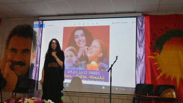 İlk sözü alan Avrupa Kürt Kadın Hareketi (TJK-E) üyesi Zozan Serhat, Sara, Rojbîn ve Rohahî'yi anarak başladığı konuşmasında “Önderliğimizin direniş çizgisini esas alarak Kürt halkının ve Kürt kadınların özgürlüğü için mücadele veren 3 yoldaşımız, dünya kadın devrim tarihine altın harflerle yazdırmıştır. Özgürlüğün bedeli oldukça ağırdır. Sakine, bu ağır bedeli Amed Zindanında Esat Oktay Yıldıran’a karşı verdi. Bugün Rojava’da Medya Savunma Alanlarında bu mücadele devam ediyor. Eğer Sakineler, Mazlumlar direnmemiş olsalardı bugün o direniş olmazdı. Önder Apo bir süreç başlattı. Önderliğin bu çabasına karşı Paris’te Sara, Rojbîn, Ronahî katledildi. Üç kadın devrimci katledildikten sonra dönemin Fransa Cumhurbaşkanı Kürtlere söz verdi. Bu katliam açığa çıkarılacaktı. Şu ana kadar bir gelişme olmadı. Sakine Cansız dünya kadınları için bir öncüdür.