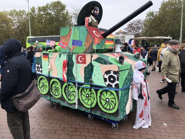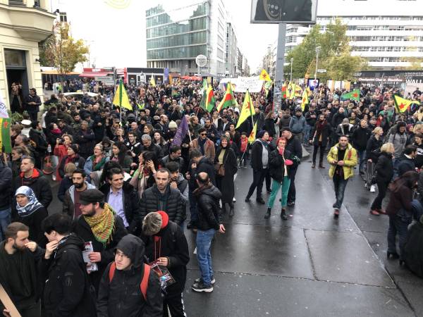 Kürdistanlılar, Türkiyeliler ve Almanların yanı sıra birçok halktan binlerce aktivistin de yerine aldığı yürüyüşte sık sık “Terörist Erdoğan”, “Alman panzerleri Kürdistan’dan defol” ve “Yaşasın Rojava direnişi” gibi sloganlar atıldı. Göstericilere hitaben TEV-DEM Koordinasyon Üyesi Foza Yusuf da bir konuşma yaptı.