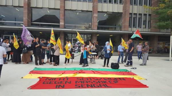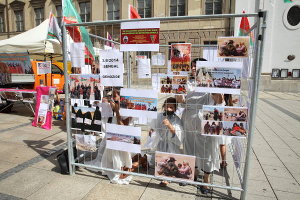 Nuda Kadın Meclisi tarafından organize edilen stand eyleminde Freiburg Demokratik Kürt Toplum Merkezi tarafından da destek verildi. Enformasyon standında çevreden geçenlere katliam ile ilgili bilgi verilirken, yüzlerce bildiri de dağıtıldı. Şengal katliamında DAİŞ tarafından esir alınan ve sonradan kurtarılan kadınlar da yaşadıkları hakkında paylaşımlarda bulundu.
