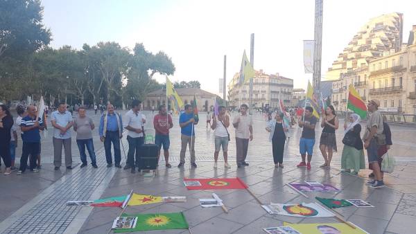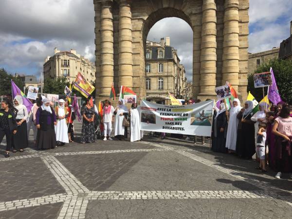 Bordeaux Sosyalist kadınlar birliği ve TJK-E Bordeaux Kürt kadın hareketinin öncülüğünde Victoria meydanında bir araya gelen kadınlar, Fransızca "Daiş'e karşı savaşanların yanındayız" pankartı taşıdı. Eylemde sık sık "Katil Daiş", "Kadın, Yaşam, Özgürlük", "Yaşasın Şengal Direnişi", " Kahrolsun Türk Devleti" sloganları atıldı.