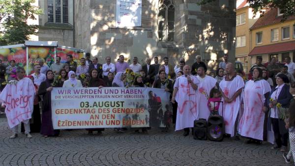 Saarbrücken Demokratik Kürt Toplum Merkezi öncülüğünde düzenlenen anma etkinliğine Saarlan“da yaşayan Êzidî kadınlar beyaz elbiseler giyinerek katıldı.