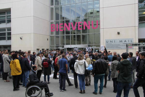 Ankara’da 63 gündür işlerine geri dönmek için açlık grevinde olan Nuriye Gülmen ve Semih Özakça’nın direnişine destek olmak amacıyla, barış bildirisine imza attıkları için işlerinden olan sürgün akademisyenler öncülüğünde Cenevre Üniversitesinde basın açıklaması gerçekleştirildi.