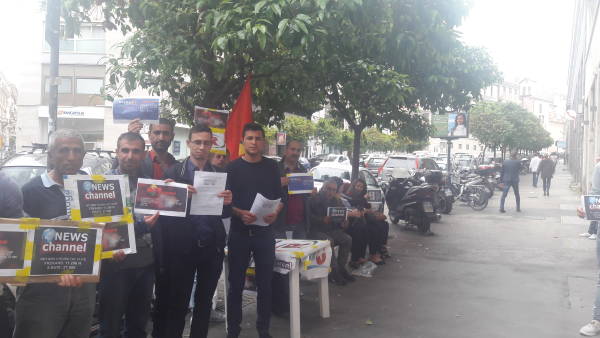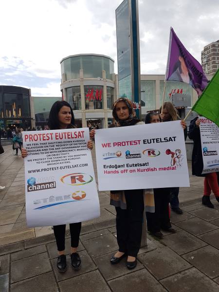 “Kürt medyası susturulamaz ve karartılamaz” diyen eylemciler sık sık Erdoğan ve Eutelsat arasındaki suç ortaklığını kınayan sloganlar attı ve bildiriler dağıttı.