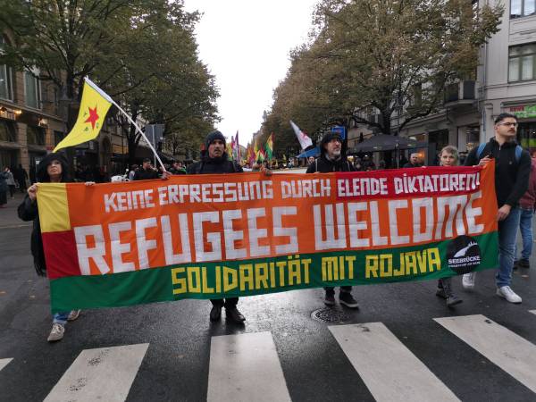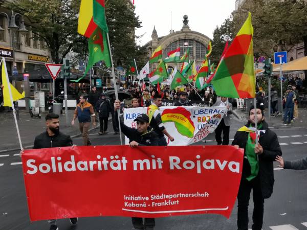 Akşam saatlerine doğru Frankfurt merkez tren garı önünden başlayan yürüyüşte “Yaşasın Rojava direnişi”, “Erdoğan Kürdistan’da katliam yapıyor” ve “Rojava devrimi ile direnişini selamlıyoruz” pankartı taşındı. Yüzlerce PYD, YPG, YPJ bayraklarını açan, sık sık “Terörist Erdoğan”, “Çocuk Katili Erdoğan”, “Dün Hitler bugün Erdoğan” ve “Avrupa finanse ediyor, Türkiye bombalıyor” sloganları atan kitle Römer meydanına doğru yürüyüşe geçti.