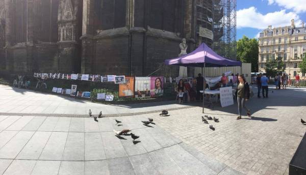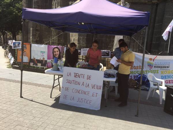 Hôtel de Ville önünde açılan çadırda, tutsak eş başkanlar Figen Yüksekdağ ve Selahattin Demirtaş'ın, Suruç şehitlerinin, açlık grevinin 143 gününde olan Nuriye Gülmen ve Semih Özakça'nın fotoğrafları, "Sur, Cizre, Nusaybin için adalet", "Suruç için adalet", tutuklu gazeteciler Meşale Tolu ve Deniz Yücel'in fotoğraflarının olduğu "Tutuklu gazetecilere özgürlük" yazılı dövizleri açıldı.