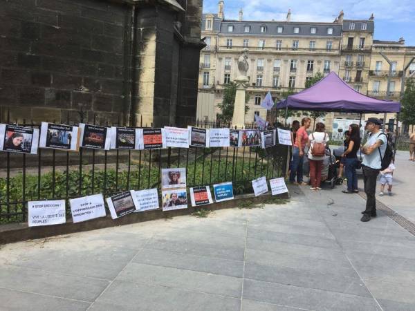HDK-Avrupa üyeleri, Bordeaux kentinde HDP'nin "Durmayalım, dur diyelim, faşizmi durduralım" sloganıyla başlattığı eylemi desteklemek amacıyla dayanışma nöbetine başladı.