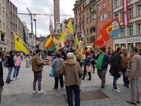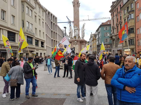 Avusturya’nın Innsbruck şehrinde Öcalan’ın özgürlüğü için Demokratik Kürt Toplum Merkezi tarafından bir yürüyüş gerçekleştirildi. Annnasauele heykeli önünden başlayan yürüyüş şehrin merkezi noktalarından geçerek yeniden aynı meydana geldi. Yürüyüş boyunca bildiriler dağıtan eylemciler sık sık “terörist Erdogan”, “Biji Serok Apo” ve “Freiheit für Ocalan” sloganları attı.