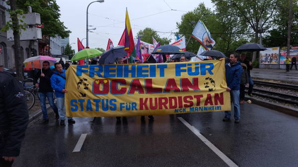 Almanya'nın Mannheim kentinde Kürt toplum Merkezi, Ronahi Berivan KM ve tüm dost kurumların katılımıyla 1 Mayıs kutlandı. Polis Kürt Halk Önderi Abdullah Öcalan'ın posterine müdahalede bulunmak istedi ancak kitle izin vermeyince halk Öcalan'ın posterleri ile yürüyüşe katıldı.
