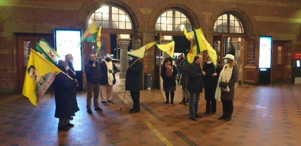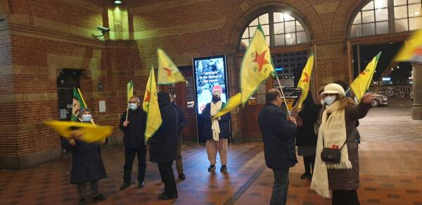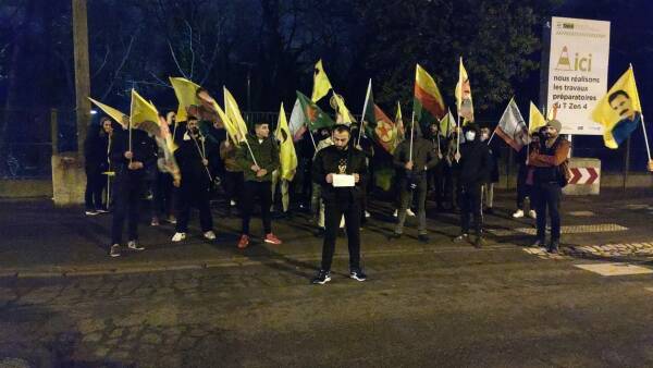 Strasbourg merkezi tren istasyonunda bir araya gelen TCŞ ve TekoJIN üyeleri, üzerinde "Faşist Türkiye Mexmur - Şengal - Rojava’dan elini çek!” yazılı pankartla birlikte Kürt Halk Önderi Abdullah Öcalan'ın posterlerini taşıdı.