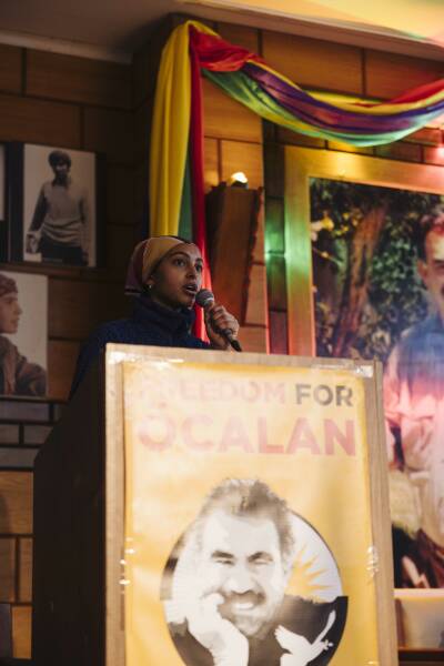 'Kürdistan Günü' etkinliğine akademisyen, siyaset bilimcisi, hukukçu, sendikacı ve farklı kesimlerden enternasyonal grup temsilcileri ile yoğun bir katılım gerçekleşti. Sendika temsilcileri, Latin Amerika, Filistin, Filipinler, Sudan, gençlik ve Siyah özgürlük hareketleri gruplarından temsilcilerinin de katıldığı etkinlikte, özgürlük mücadelesi veren toplulukların kriminalize edilmesine son verilmesi ve Rojava devrimini savunma çağrısı yapıldı. Etkinlikte Kasım 2024’ün sonunda Londra’da Kürt topluluğuna yönelik şiddetli baskınlar ve Rojava'ya saldırılar protesto edildi.