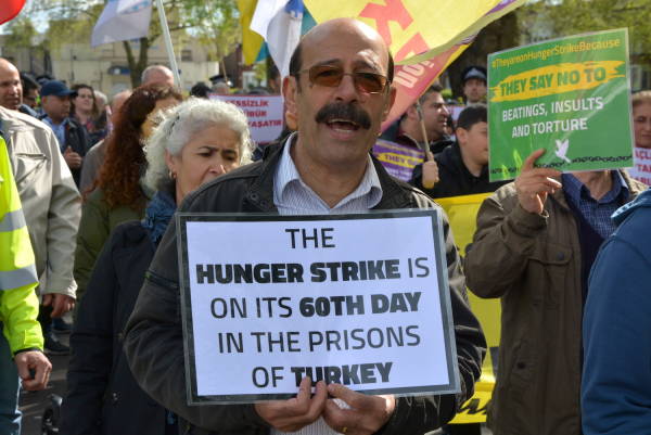 Türkiye ve Kürdistan zindanlarında 60’ıncı günü geride bırakarak devam eden açlık grevlerine destek amacıyla Londra’da kitlesel bir yürüyüş düzenlendi.