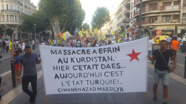 Canabiere Meydanında toplanan Kürdistanlılar, Öcalan’a özgürlük mitinginde Türk devletinin Rojava’nın Efrîn Kantonu’na yönelik saldırılarını da protesto etti.